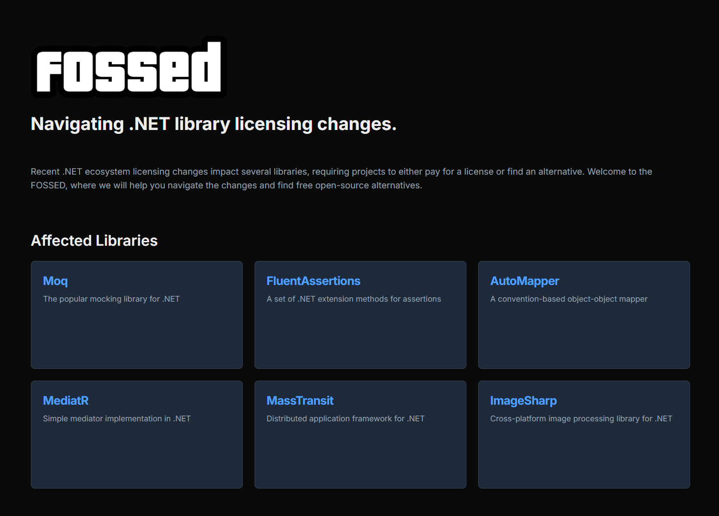 Keeping track of which libraries are changing, what the new terms are, and what viable alternatives exist can be time-consuming. FOSSED aims to be a central resource for .NET developers facing these challenges. It gathers information about affected libraries, explains the context behind the changes, and lists potential FOSS alternatives to consider.